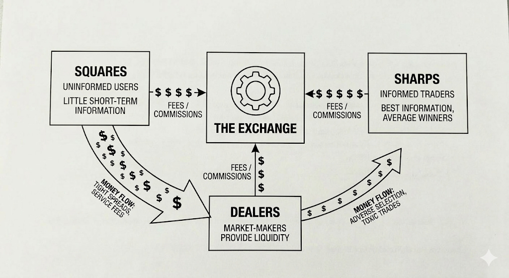 The money flows from the squares to the dealers, and from the dealers to the sharps. Each group’s activity creates flows in fees to the exchange.