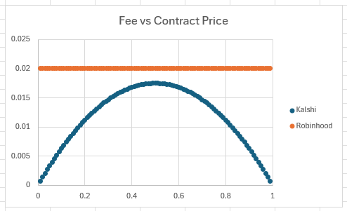 Compared to sharps, squares are less likely to be price sensitive or compare the net price between making and taking. They may also favor features like UI and ease of use - one clue is significant trading volume on Kalshi through Robinhood, despite strictly higher fees. Sharps on the other hand are trying to make small edges repeatedly, and this fee will turn a trade into a no-trade for small edges.